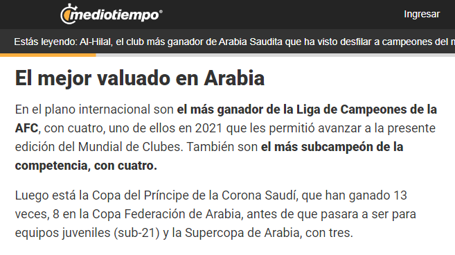 💥💥 صحيفة "mediotiempo" المكسيكية تسلط الضوء على نادي #الهلال قبل مشاركته في كأس العالم للأندية: "هم الأكثر نجاحًا في دوري أبطال آسيا برصيد 4 ألقاب، والأكثر تتويجا بالبطولات المحلية في الكرة السعودية".