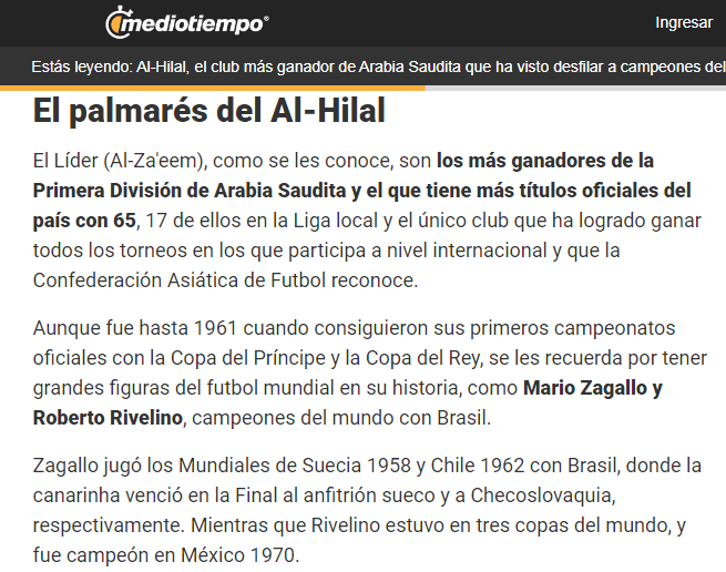 💥💥 صحيفة "mediotiempo" المكسيكية تسلط الضوء على #الهلال قبل مشاركته في مونديال الأندية:"يُعرف في بلاده بأنه القائد "الزعيم" وهو أكثر الفائزين ببطولة الدوري السعودي وأكثر من حصل على ألقاب رسمية برصيد 65 لقبا والنادي الوحيد الذي تمكن من الفوز بجميع البطولات التي شارك فيها قاريا".