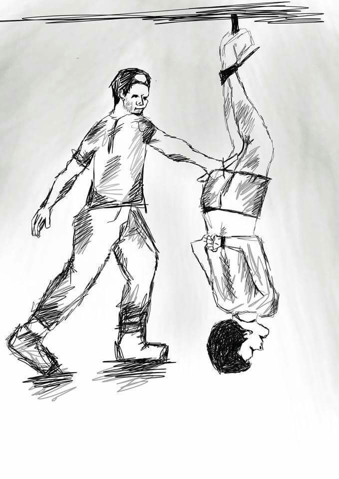 11."شراب كمان شراب مي"، كان السجين ينازع بين يديه وكأنه يغرق يحاول الخروج من مأزقه، لكن الوحوش من حوله يمسكونه جيدا ويضحكون والمياه تكاد تخرج من عينيه، إلى أن نجا وفقد وعيه حينها سحب الخرطوم من فمه..