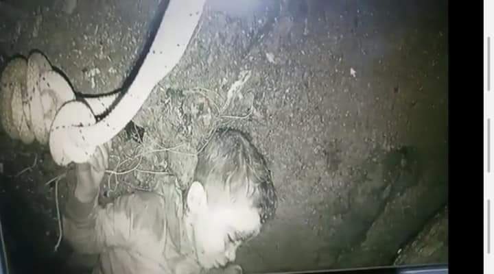 اخر صورة تم التقطها للطفل ريان المحتجز داخل البئر منذ اكثر من 44 ساعة وهو نايم الساعة 8:56 صباح هذا اليوم ماسك حبل الانقاذ.