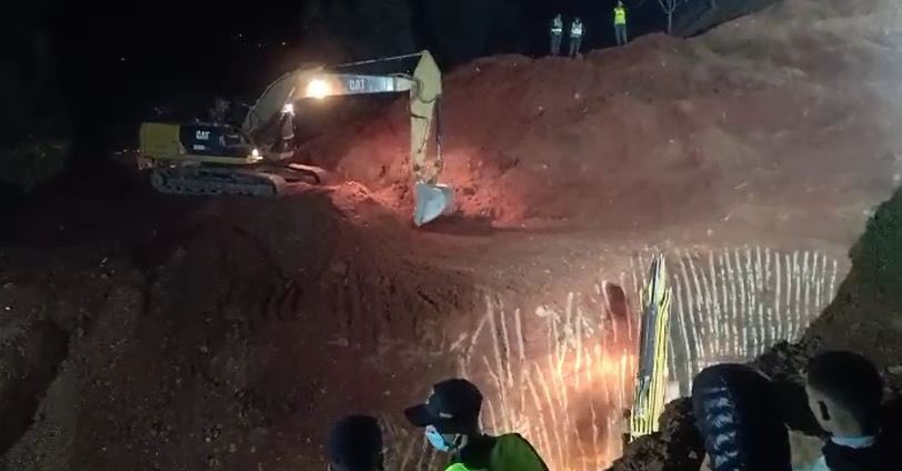 يلاحظ بالصورة ان العملية تتم بشكل المطلوب والمرسوم له،حيث استطاعوا فرق الإنقاذ من تثبيت أنابيب معدنية وكذلك هناك أنابيب خرسانية دون حدوث انهيار للتربة الهشة والعمل متواصل بلا أنقطاع…