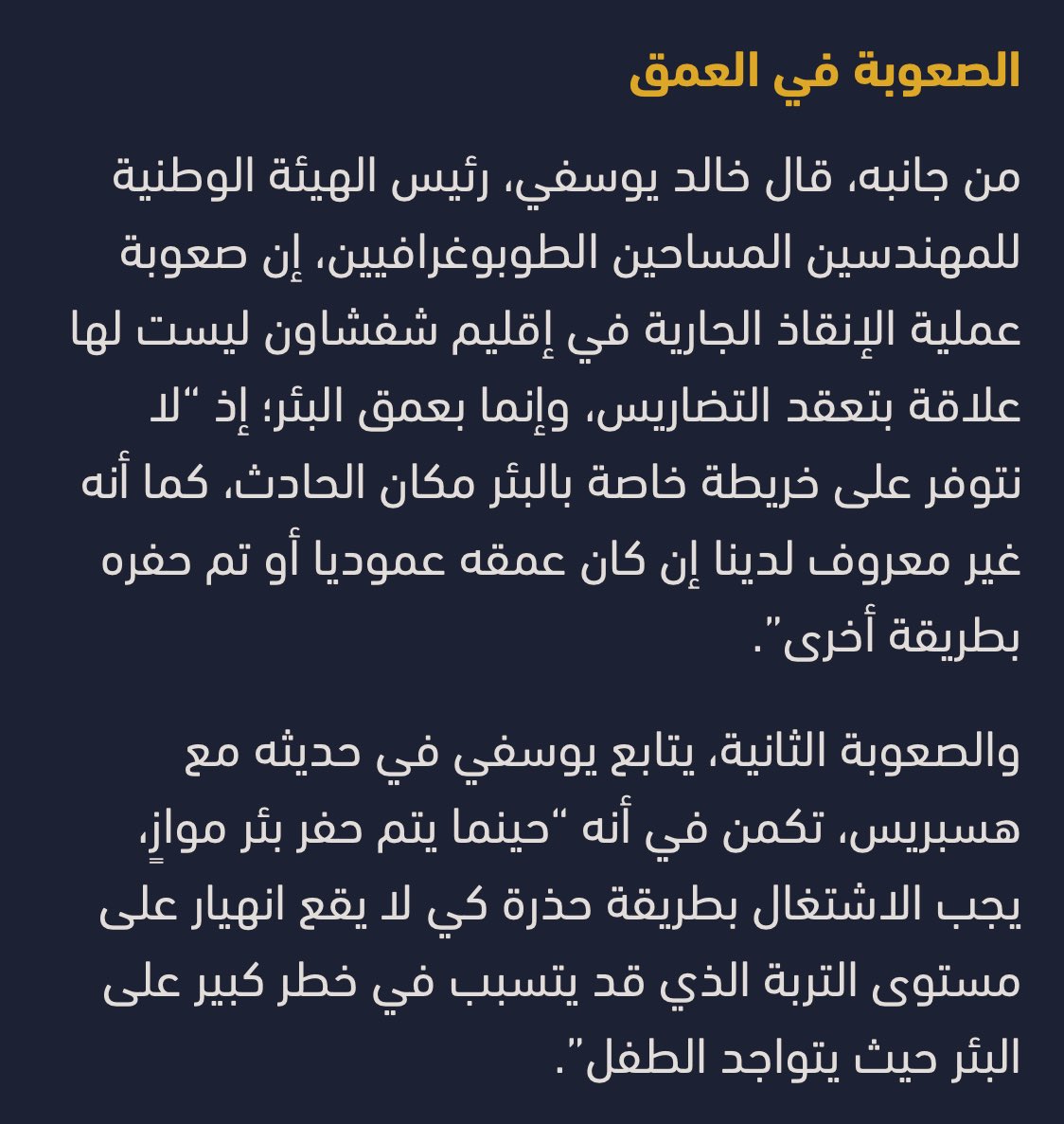 هنا إجابة من رئيس الهيئة لطوبوغرافيين تبين ان الصعوبة في عملية الانقاذ من عمق البئر لانه لا يوجد خريطة خاصة للبئر توضح المعلومات المطلوبة.