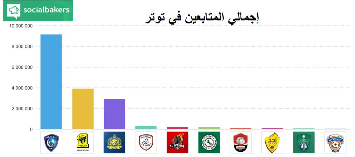 • يمتلك نادي الهلال أكبر قاعدة جماهيرية على تويتر بأكثر من 9 مليون متابع. تلاه الاتحاد ثم النصر.