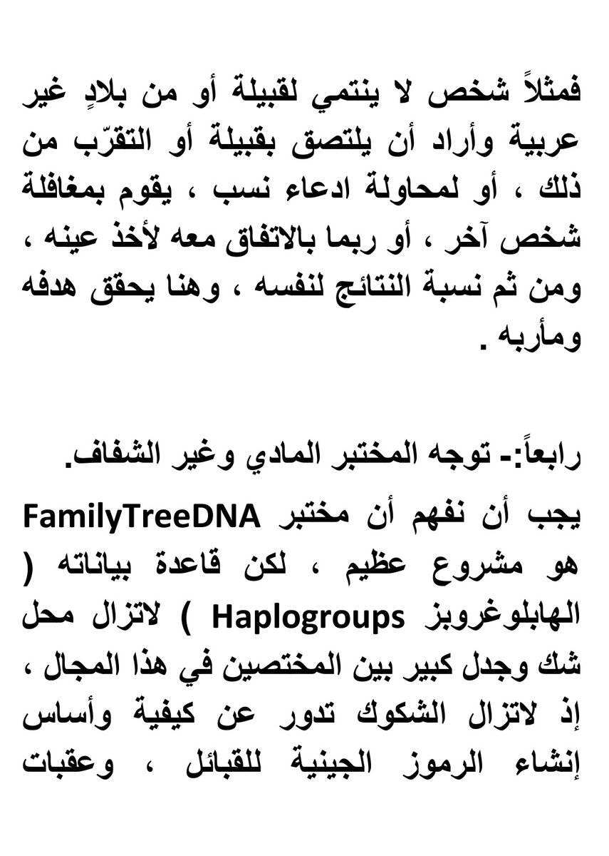 كل ذلك إذا كانت الدراسة المزعومة«حقيقية» تنسب للبروفيسور المزعوم وبعيدا عن الشخصنة فالدراسة بعيده عن الواقع الحالي بفحص الأبوة YDNA وربما أنه تعمد إيجاد مخرج لمن خالفت نتائجهم موروثهم ويريد إلغاء #العلم_الجيني_النسبي إلا أن إجابته على سؤاله كيف يُعمل التحليل؟!