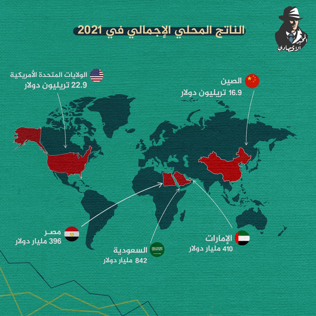تصدرت #الولايات_المتحدة و #الصين قائمة الدول الأعلى في الناتج المحلي الإجمالي، وعربيًا تصدرت #الامارات قائمة الدول العربية، تليها #السعودية ثم #مصر