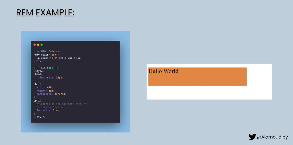 هذه الوحدة دائما ترجع في حساب حجم الشئ إلى الأساس (root) وهو في أغلب الأحيان <html> ومن فوائدها ان اذا غير مستخدم الموقع حجم الخط في المتصفح رح يتغير حجم الخط في الموقع.