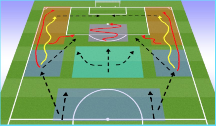 2️⃣الهدف من اللعب التموضعي🎯:هو أن المناطق والمهام الموجودة بداخلها يمكن شغلها واستخدامها من قبل لاعبين مختلفين،ليس لتحريك الكرة ولكن لتحريك المنافس عن طريق التبديل السريع للمراكز لإيجاد مكان للتمرير من أجل منح ميزة التقدم للأمام نحو للمرمى