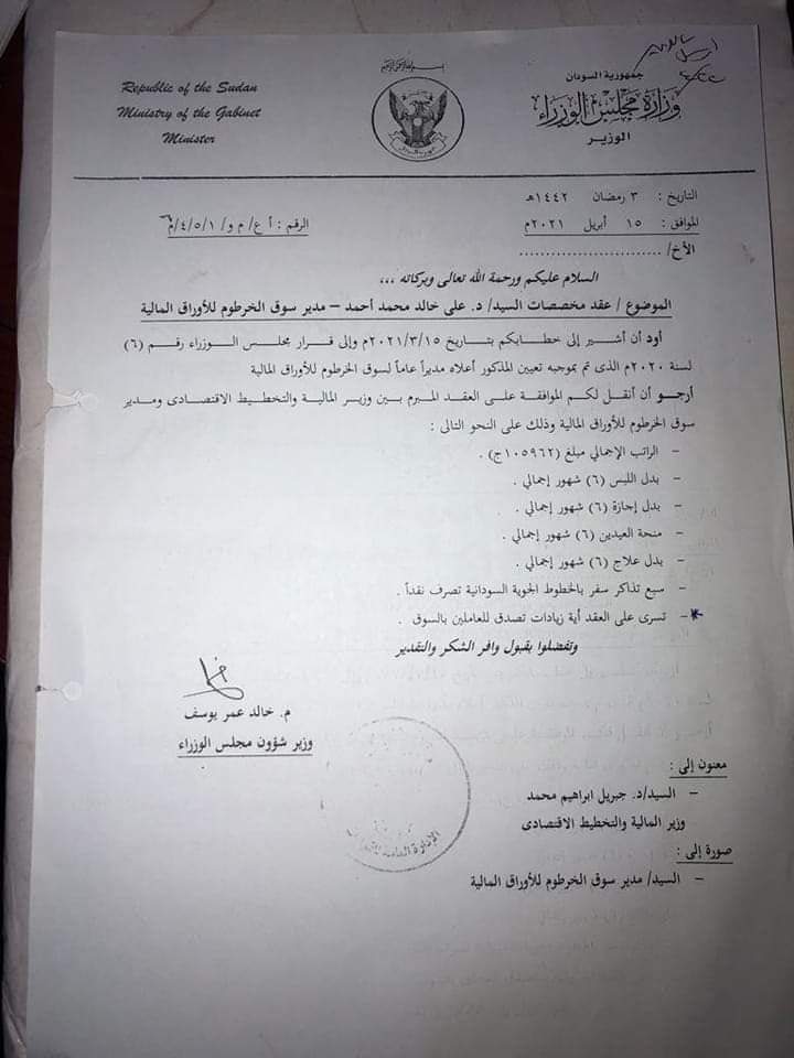ثانياً: كما هو موضح في الخطاب، فإن التعاقد تم من قبل وزارة المالية ودوري يقتصر على نقل موافقة مجلس الوزراء وفقاً لقراره الموضح في الخطاب لا أقل ولا أكثر.