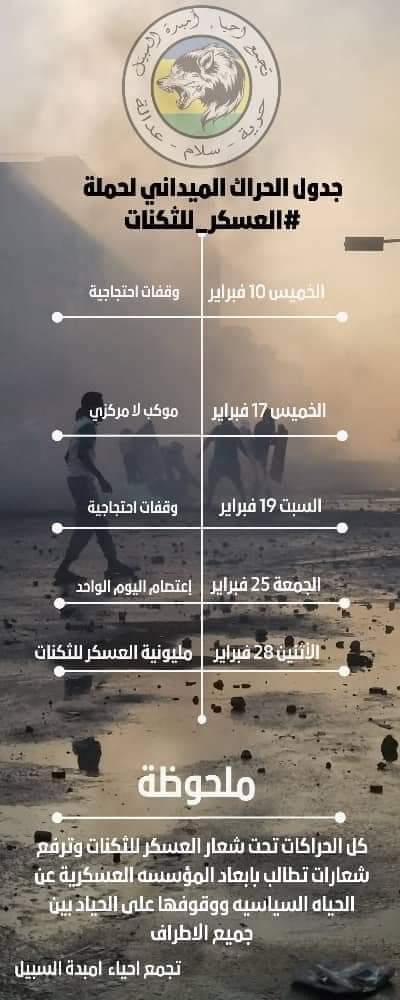 تقرر ان يصاحب الحملة فعاليات ميدانية لمزيد من لفت النظر لاهمية الامر ، وندعو من هنا تنسيقيات لجان المقاومة بولاية الخرطوم والولايات لتبني الحراك مع تسمية مليونية ٢٨ فبراير بمليونية #العسكر_للثكنات تحقيقا لمطالب الشعب