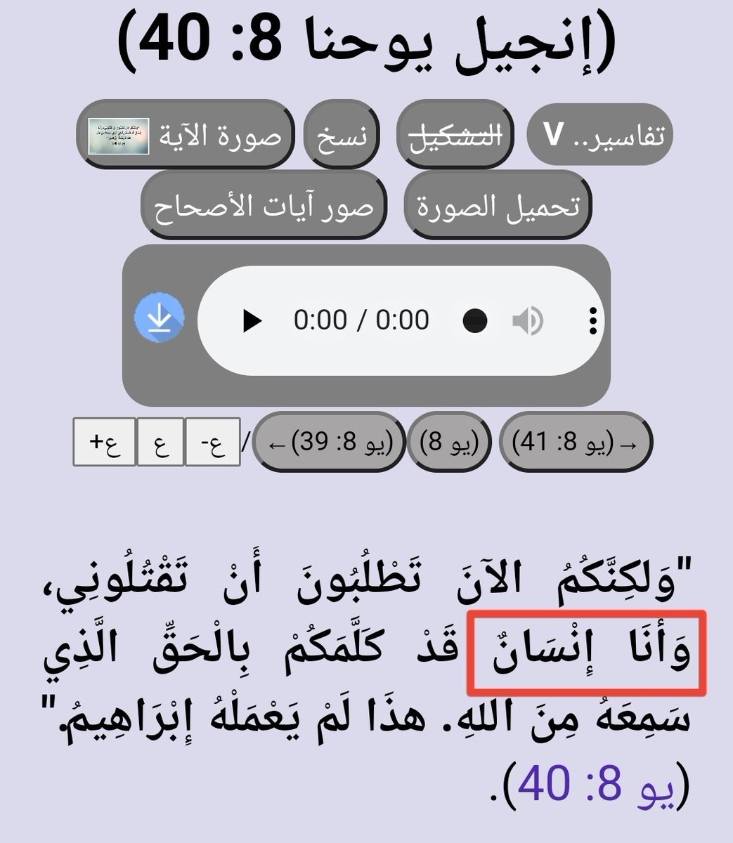 إنجيل (يوحنا ٨ : ٤٠) : (( وأنا إنسان قد كلمكم بالحق الذي سمعه من الله )).