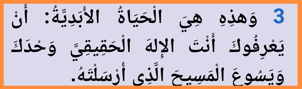 في إنجيل (يوحنّا ١٧ : ٣) يقول المسيح عليه الصلاة والسلام للآب : (وتلك هي الحياة الأبدية أن يعرفوك أنت الإله الحقيقي وحدك ويسوع المسيح الذي أرسلته).