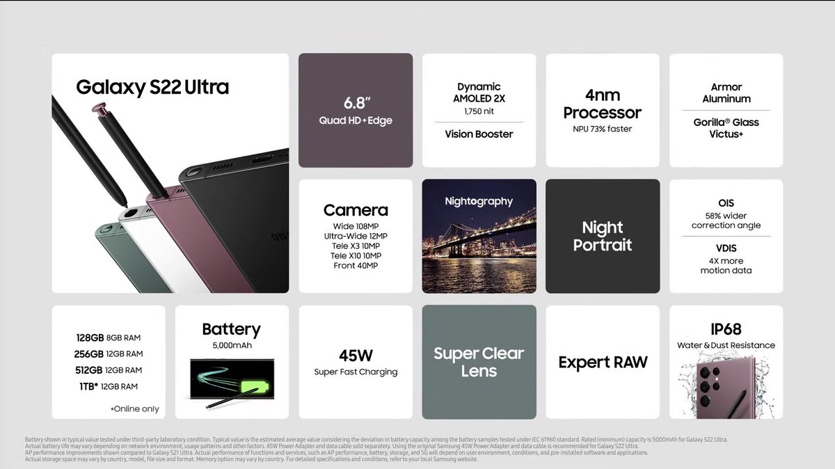 الحديث عن كاميرات الجالكسي اس٢٢ الترا.. عدسات مُحسنة وتعطي دقة اعلى و تقريب ١٠٠ مرة افضل من اي وقت مضى.. ايضا الذكاء الاصطناع يساعد في رفع مستوى الصور خصوصا في التقريب و الرؤية الليلية.