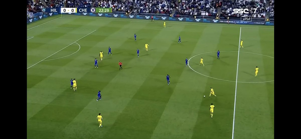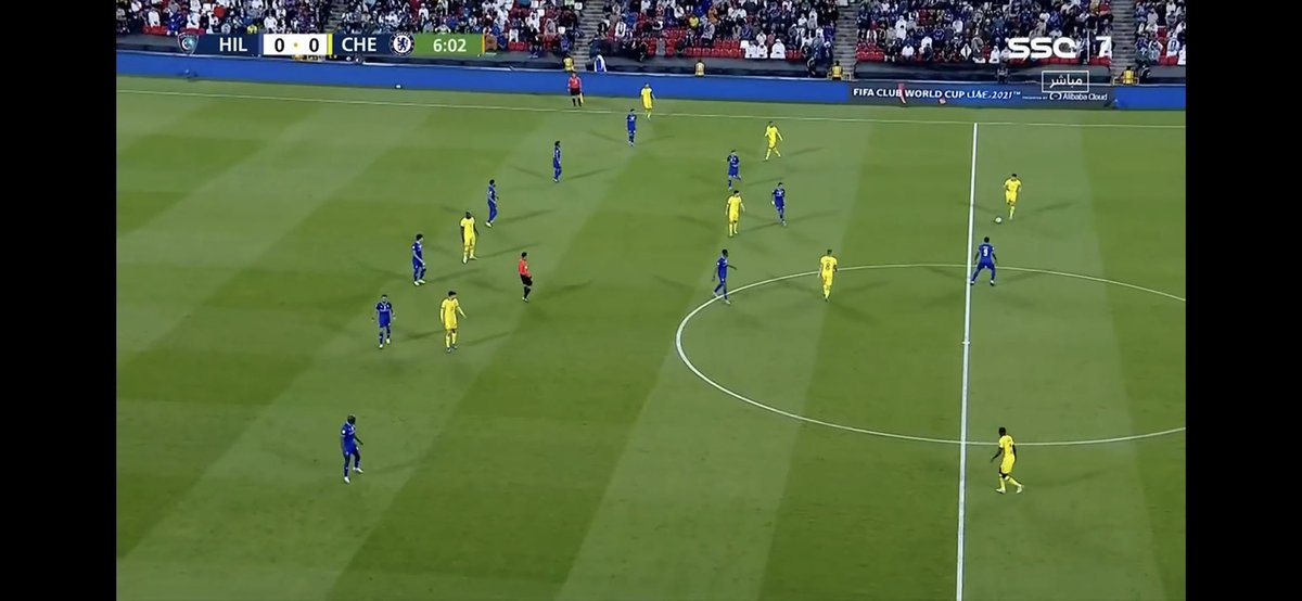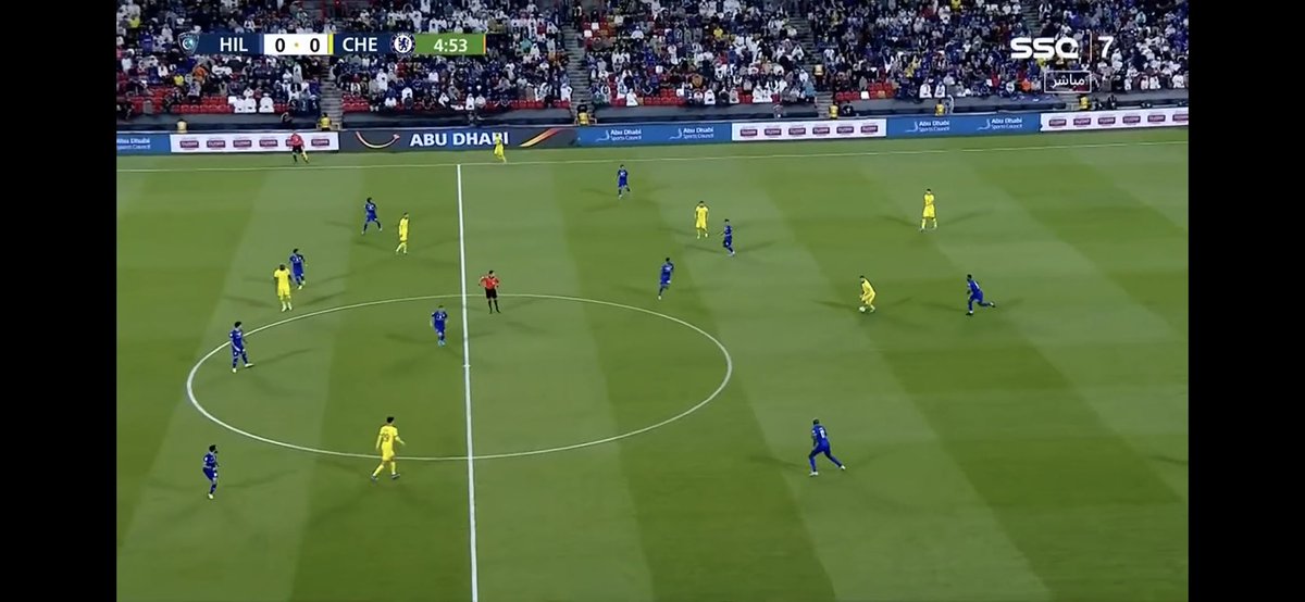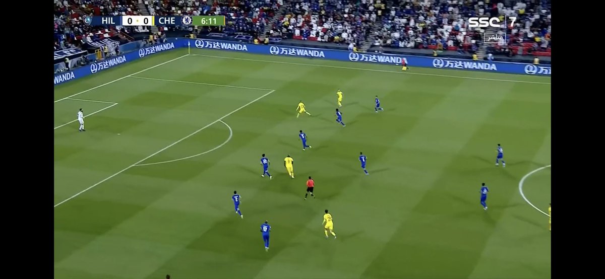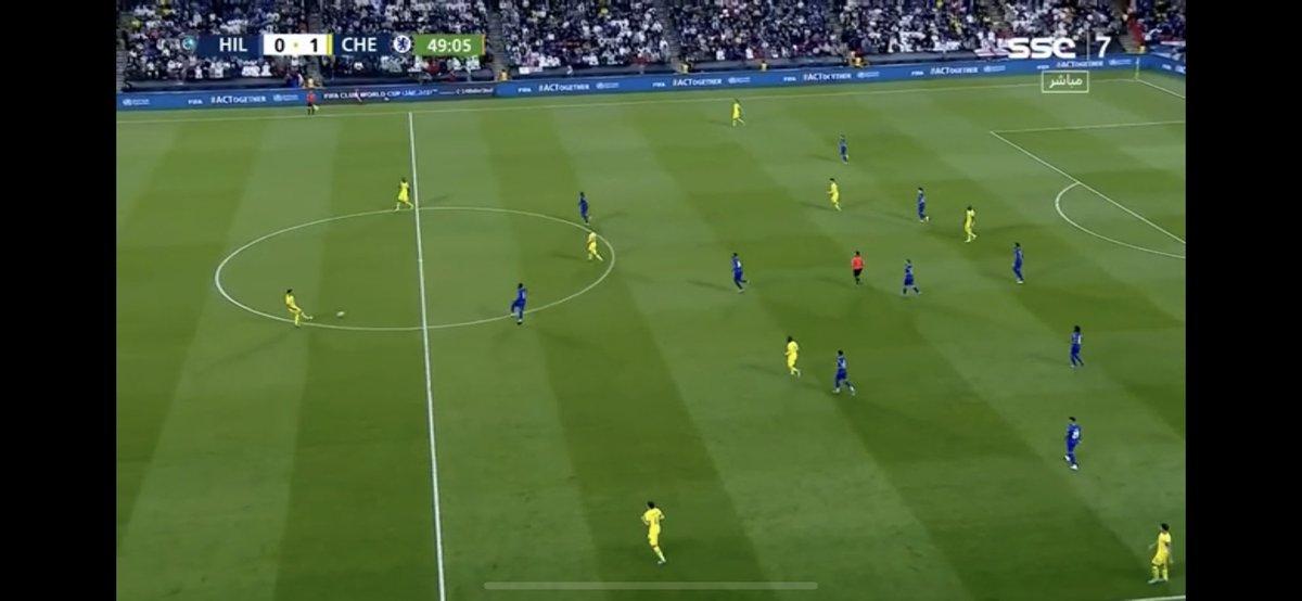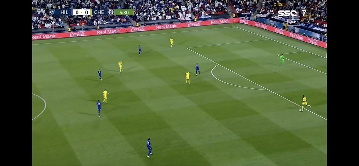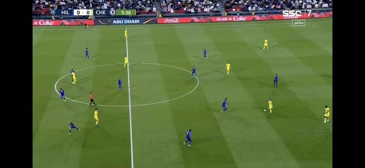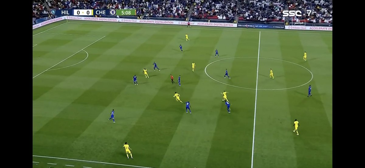 ضغط عالي كان يرهق تشيلسي ويجبره على اللعب الطويل والخطأ بالتمرير، لكن لاحظ معي بحالة الضغط نقطة مهمة تطبق هنا وهي ايقاف الخروج بالكرة عبر الاطراف 👏🏻