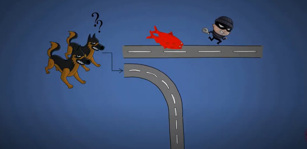 تقنية التضليل في هذه المغالطة: فمستخدم المغالطة لا يهرب من الموضوع بطرحه لموضوع آخر وحسب، وإنما يحاول بذكائه أن لا يظهر أنه غير من الموضوع، كما حدث بالظبط مع المجرم الذي هرب من السجن بوضعه لسمكة الرنجة الحمراء وتضليل الكلاب.