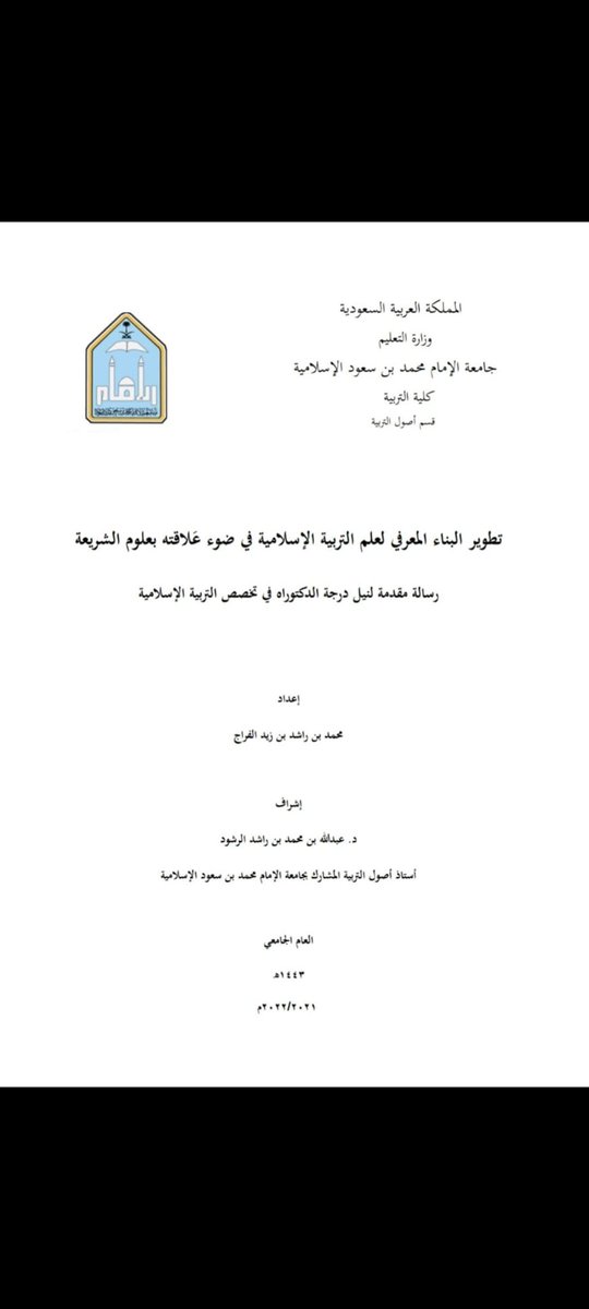 قصتي مع #رحلة_الدكتوراه #رسالة_الدكتوراه وعنوانها: "تطوير البناء المعرفي لعلم التربية الإسلامية في ضوء علاقته بعلوم الشريعة" ستكون في سلسلة تغريدات؛ لعلّه يجد فيها المتخصص في #علم_التربية_الإسلامية و #الدراسات_العليا شيئا يستحق القراءة، أو فليمرّها كما جاءت :)
