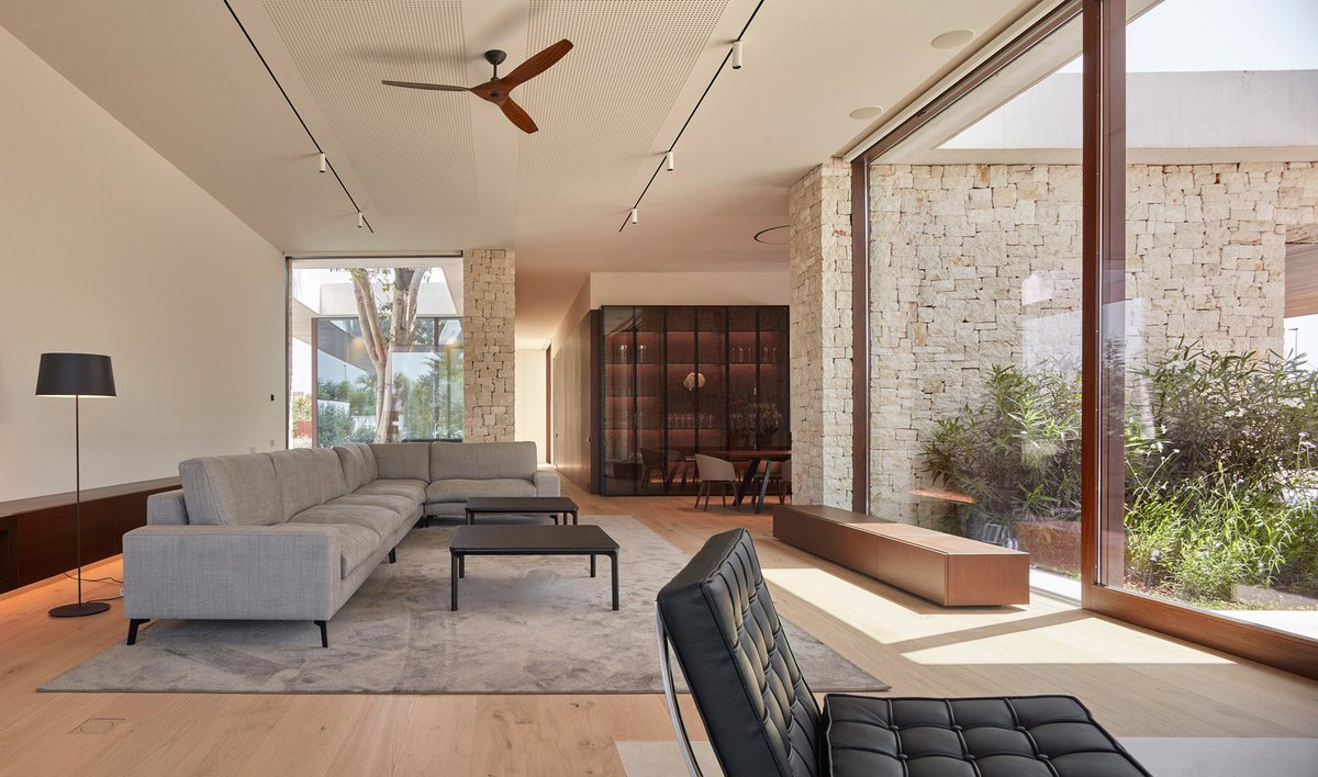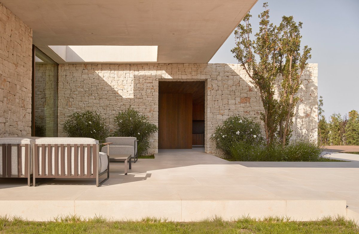 تراها باطلالة مباشرة واخرى ثانوية دون اخلال بمسارات الحركة وترى مادة التشطيب " الحجر الطبيعي" تربط الخارج بالداخل وتتمازج مع الدهان