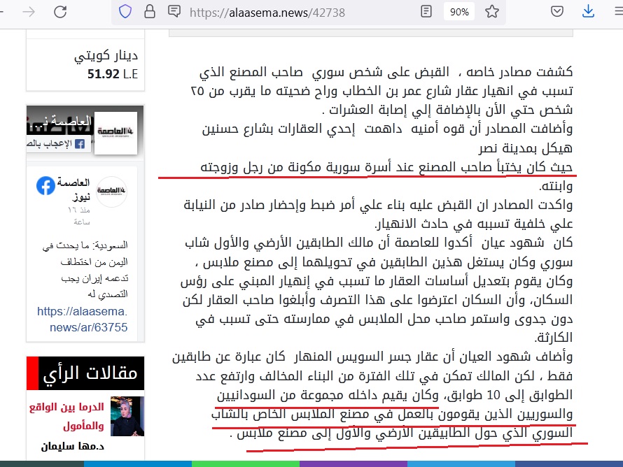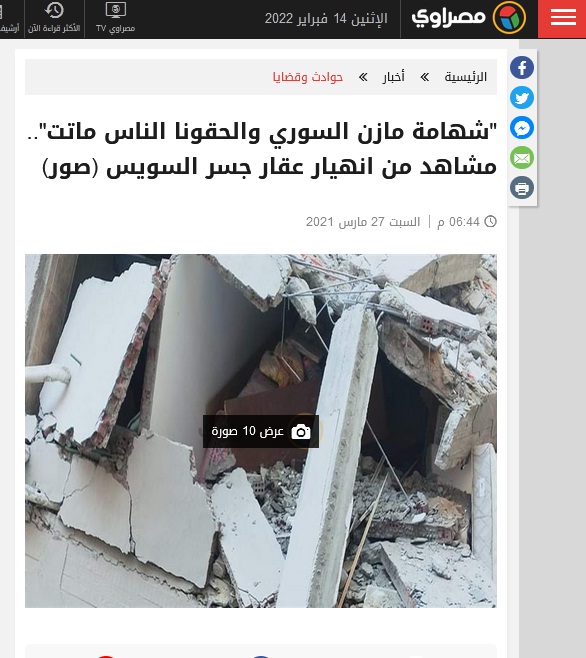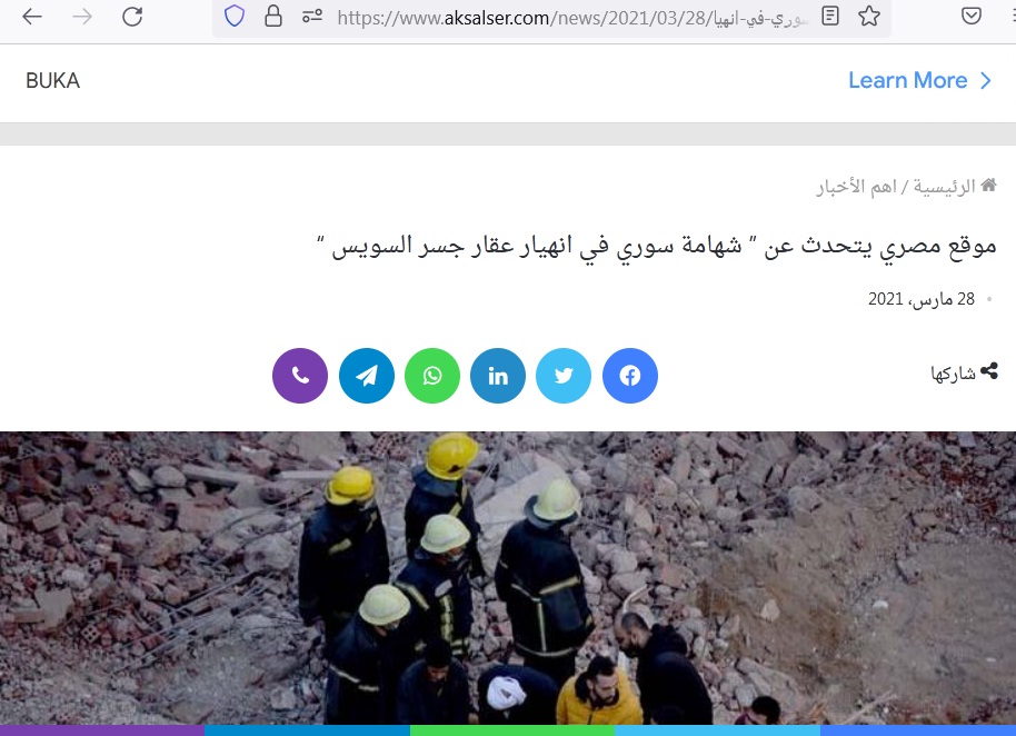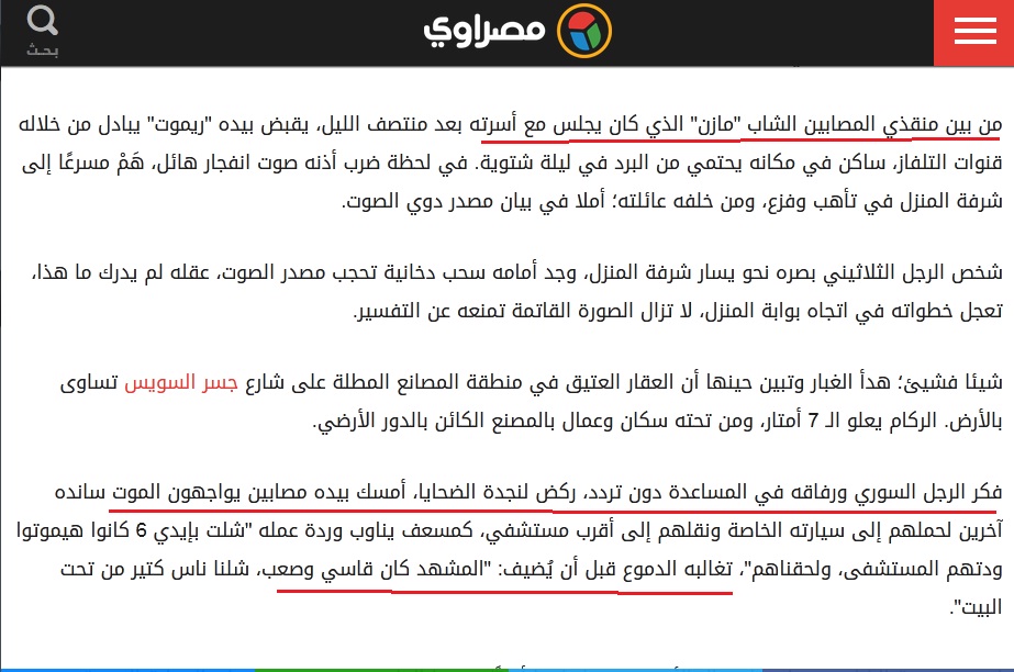 موقع مصري يتحدث عن شهامة سوري في انهيار عقار جسر السويس