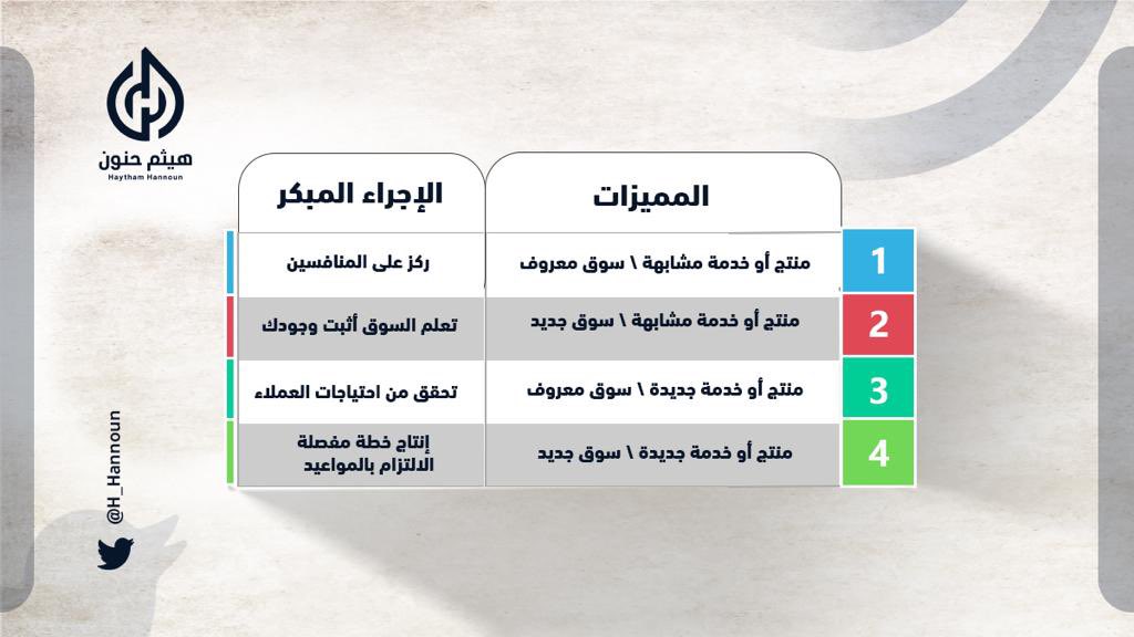 في هذا الربع #الشركة تريد عرض منتج جديد ولعملاء جدد كلياً، ولا يوجد بالعادة منتج مشابه عند المنافسين، بل إن مواصفات العملاء الذين قد يخدمهم هذا المنتج قد لا تكون واضحة. #market #Risk #strategy #customers #developments #Competition #company #service