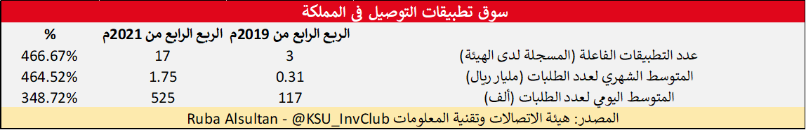 3-أشارت هيئة الاتصالات إلى تحقيق القطاع نموًا لافتًا، حيث ارتفع المتوسط اليومي لعدد الطلبات من 117 ألف طلب إلى 525 ألف طلب بنسبة زيادة 350%، استحوذت الشركات الرئيسية في القطاع (هنقرستيشن-جاهز-مرسول) على نسبة تتراوح ما بين (85%-90%) من إجمالي توصيل الطعام عبر التطبيقات
