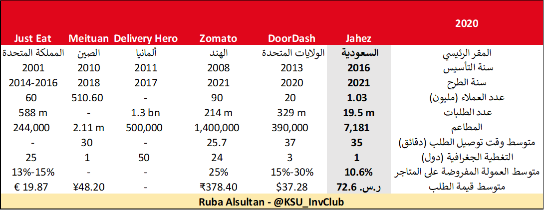 تعد الشركة المنافسة(أ) الأكبر في المجال وواحدة من أولى منصات طلب الطعام في المنطقة، بالإضافة إلى أكبر تغطية جغرافية تشمل (106) مدينة في حين تعد الشركة المنافسة (ب)الثالثة في المجال من ناحية الحصة السوقية، وتتواجد في أكثر من (40) مدينة، وتمتلك أكبر قاعدة لمناديب التوصيل في المملكة