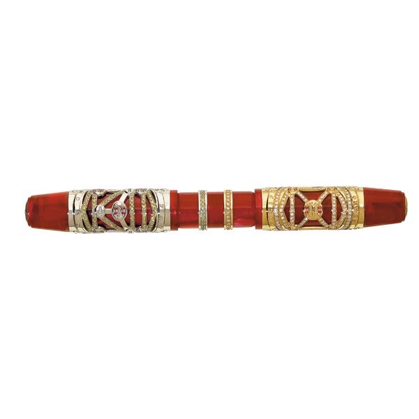 مرصع باكثر من ٢٠٠٠ماسه منهم علي الغطاء ١٩١٩ماسه اشاره لسنه تاسيس شركه اورورا اهم ميزه فيه ان سن القلم ممكن يطبع عليه اول حرف من المالك للقلم