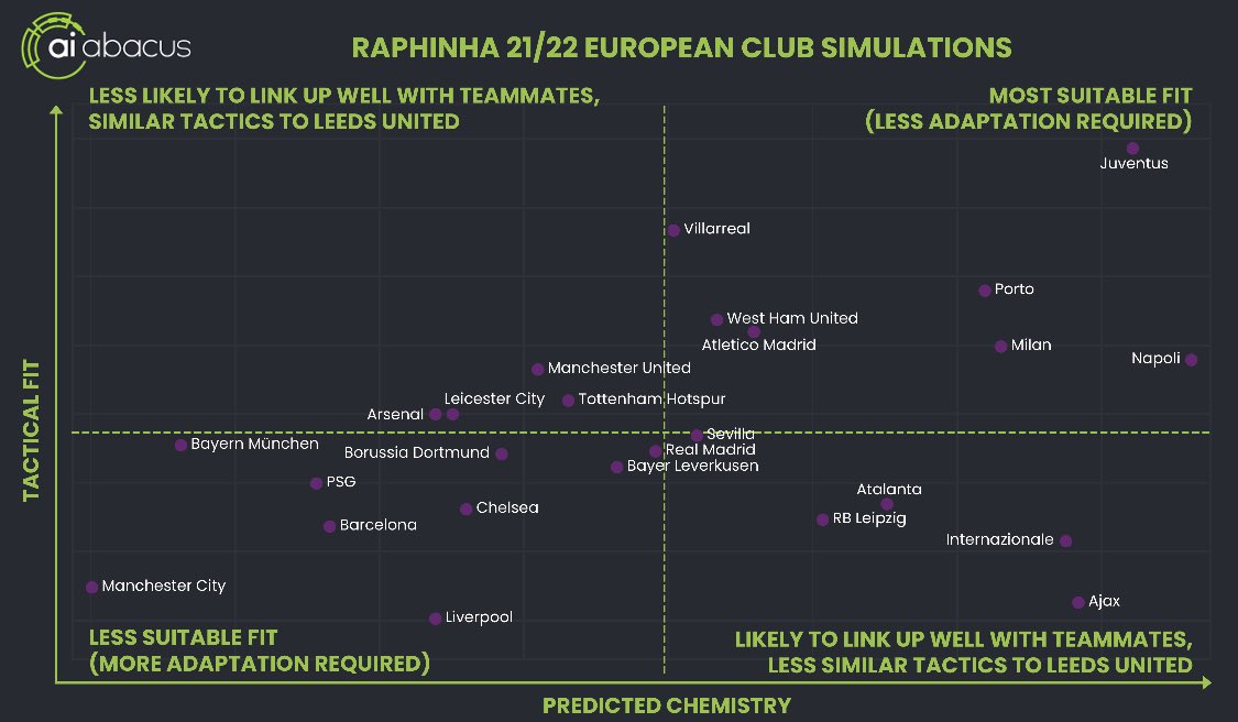 على وجه التحديد ، يتوقع النموذج أن رافينها سيتطلب أقل قدر من الوقت للتكيف مع أسلوب يوفنتوس التكتيكي عند التفكير في نظام اللعب الحالي ليدز. من نواح كثيرة ، يعتبر أسلوب ليدز في فئة خاصة به