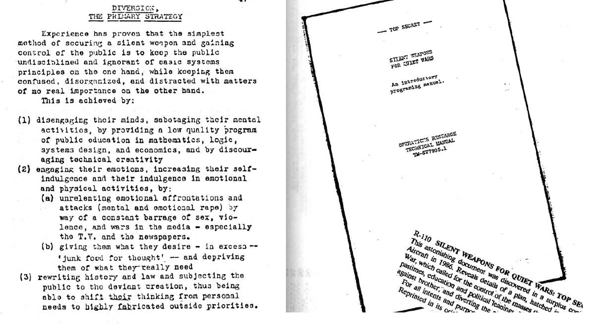 أخيرا وجدت النسخة الأصلية التي وضعتها النخبة الاقتصادية والسياسية الأمريكية بعنوان "أسلحة صامتة وحروب هادئة" للسيطرة على الجماهير ويعود تاريخها إلى نهايات أربعينيات القرن العشرين بعد نهاية الحرب العالمية الثانية بسنوات قليلة. وجاء فيها هذه التفاصيل عن كيفية إلهاء الجماهير: