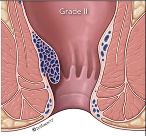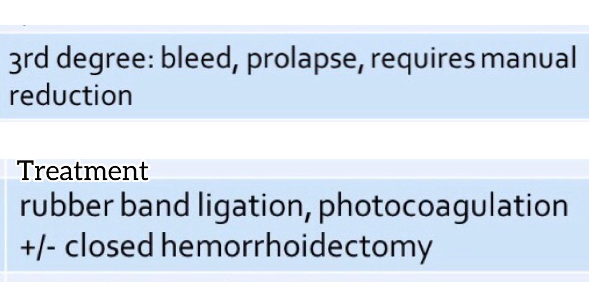 - درجة ثالثة: تنزف وتتدلى وتتطلب إرجاعها يدويًا —> تعالج بالربط بالشريط المطاطي أو التخثير الضوئي أو بإزالتها بالعملية الجراحية.