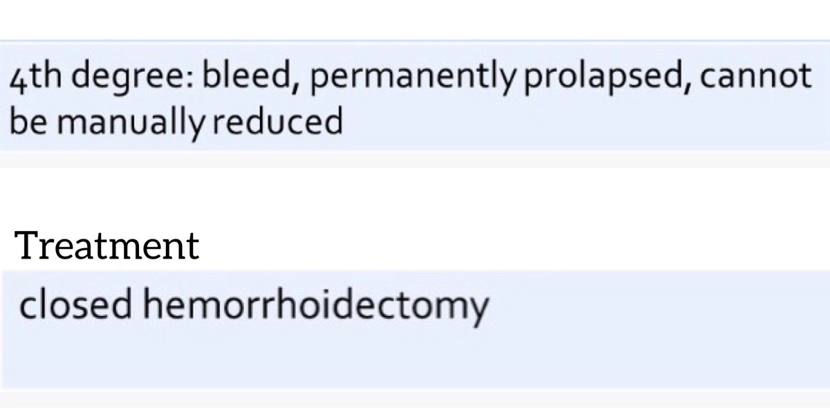 درجة رابعة: تنزف وتتدلى بشكل دائم ولا يمكن ارجاعها يدويًا —> تعالج بإزالتها بعملية جراحية.