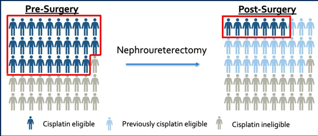 نقطة مهمة جدا أيضا: بسبب خسارة الكلية بعملية الاستئصال فالكثير من المرضى يصبح غير مؤهلا لتلقي العلاج الكيماوي بـ Cisplatin بعد الجراحة بسبب تدني وظائف الكلية. (تنخفض نسبة القدرة على تلقي الكيماوي من 58% قبل الجراحة إلى 15% بعد الجراحة).