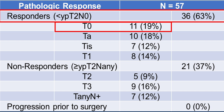 هدف الدراسة Primary Endpoint كان نسبة المرضى الذين يحققون استجابة ورمية ليصبح السرطان غير غازٍ Pathologic Response <ypT2N0
