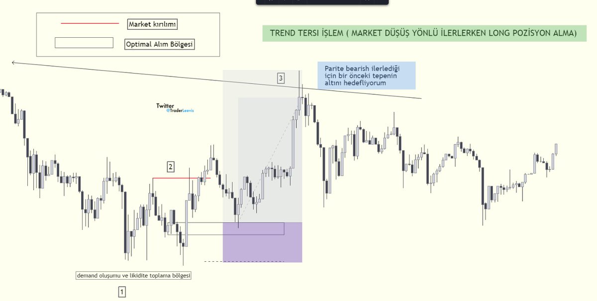 Trend düşüş yönlü devam ederken, long işlem aramak için, market kırılımı her zaman işe yaramayabilir. Fakat bu işlemde market kırılımı ve optimal alım bölgesi işe yarıyor. Hedef bir önceki tepenin altı. Bunun sebebi marketin düşüş yönlü olması. Okuduğunuz için teşekkürler
