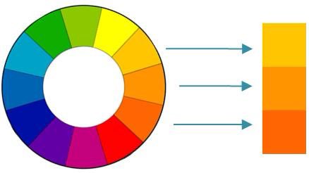 هنا نبدأ باختيار لون واحد كأساس للمشروع ثم اللونين المجاورين له كالأخضر المزرق والبنفسجي المزرق إذا كان اختيارنا الأساس هو الأزرق وهذا الأسلوب يعطي الفراغ طيفاً لونياً واحداً.