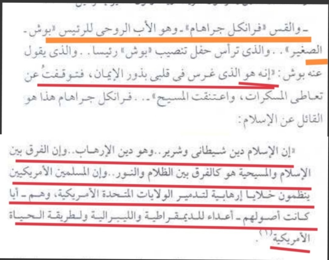 أما القس فرانكل جراهام الأب الروحي لبوش الابن فيقول:(الإسلام دين شيطاني وهو دين الإر8اب وإن الفرق بين المسيحية والإسلام كالفرق بين الظلام والنور وإن المسلمين الأمريكين هم خلايا نائمة هدفها تدمير أمريكا