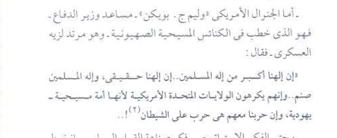 وأعلن مساعد وزير الدفاع الأمريكي وليم بويكن عدائه الشديد الإسلام قائلا:(إن إلهنا أكبر من إله المسلمين...إن إلهنا حقيقي وإله المسلمين صنم وإن حربنا مع المسلمين هي حرب مع الشيطان....) #غزة_تحت_القصف