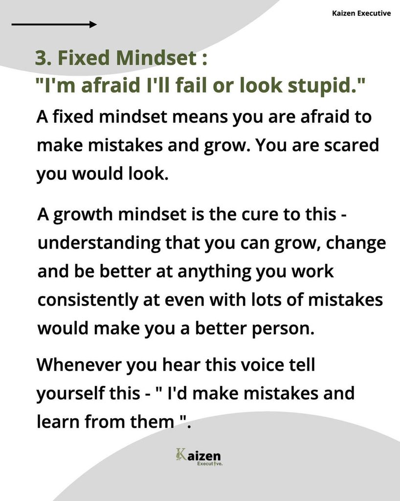 العقلية الثابتة تعني أنك تخشى ارتكاب الأخطاء و أن تنمو. عقلية النمو هي العلاج لهذا الفهم بأنه يمكنك أن تنمو وتتغير وتكون أفضل في أي شيء تعمل به باستمرار حتى مع وجود الكثير من الأخطاء التي من شأنها أن تجعلك شخصاً أفضل.
