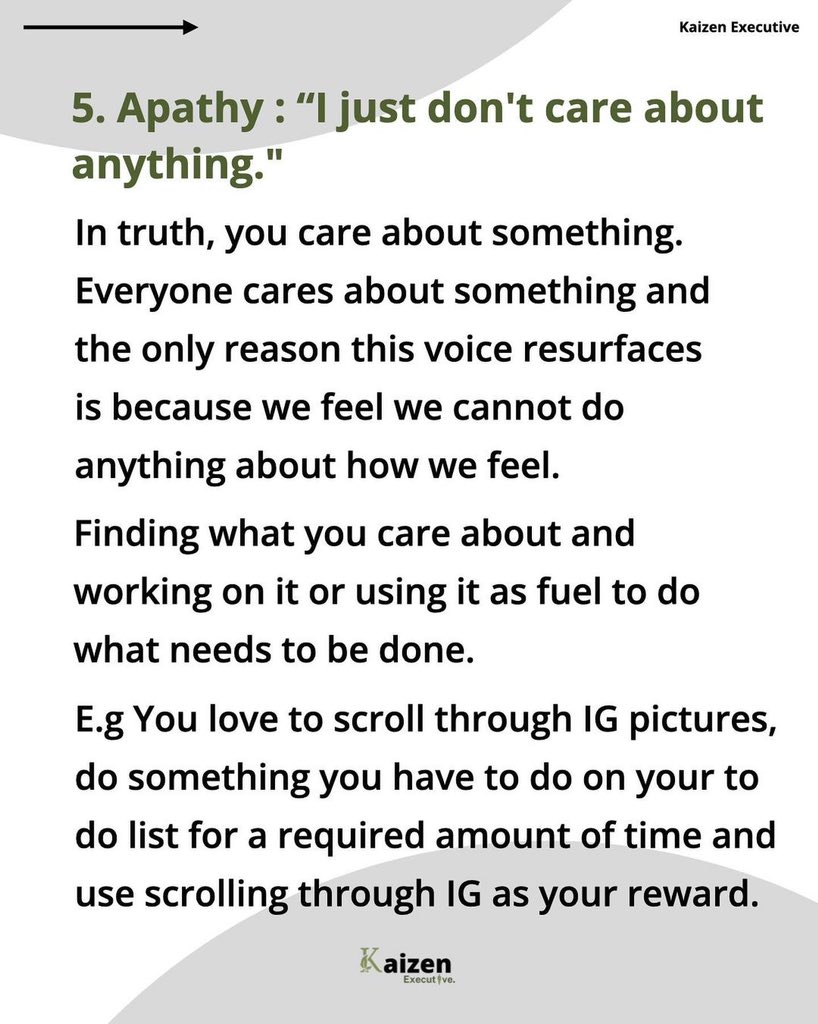 بدلاً من قراءة كتاب أو المشاركة في دورة التدريبية تدفعك إلى الأمام، تظل عالقاً و لا تفعل شيئ. بلا شك هناك أوقات شعرت بها بالانجاز، خاصة عندما تبدأ شيئاً جديداً وتتفوق في أشياء لم يكن بإمكانك فعلها من قبل. فكّر في تلك الأوقات واستخدمها كوقود لتبدأ.
