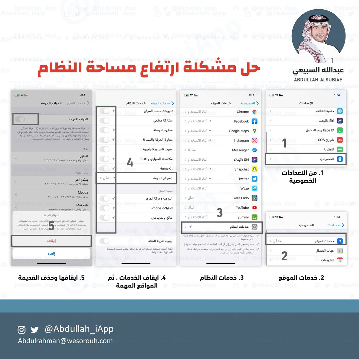 ▫️من احد الاسباب ارتفاع مساحة النظام / لملفات مخزنة في الجهاز ( مثل سجل التصفح في سفاري - تحديد المواقع بشكل تلقائي -🔻