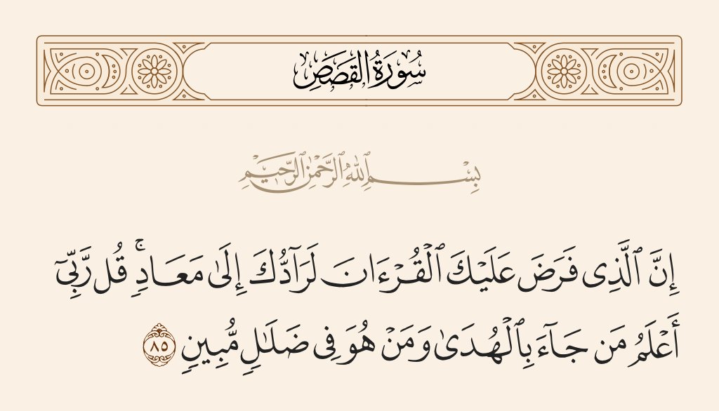 2/وختَمت السورة الكريمة #سورة_القَصَص بذِكر وعد الله لرسوله مُحمّد صلّى الله عليه وسلّم برجوعه مُنتصراً (( إن الذي فَرَض عليك القرآن لرادُّك إلى معاد قُل ربي أعلّم من جاء بالهُدى ومن هو في ضلال مُبين)) 👇