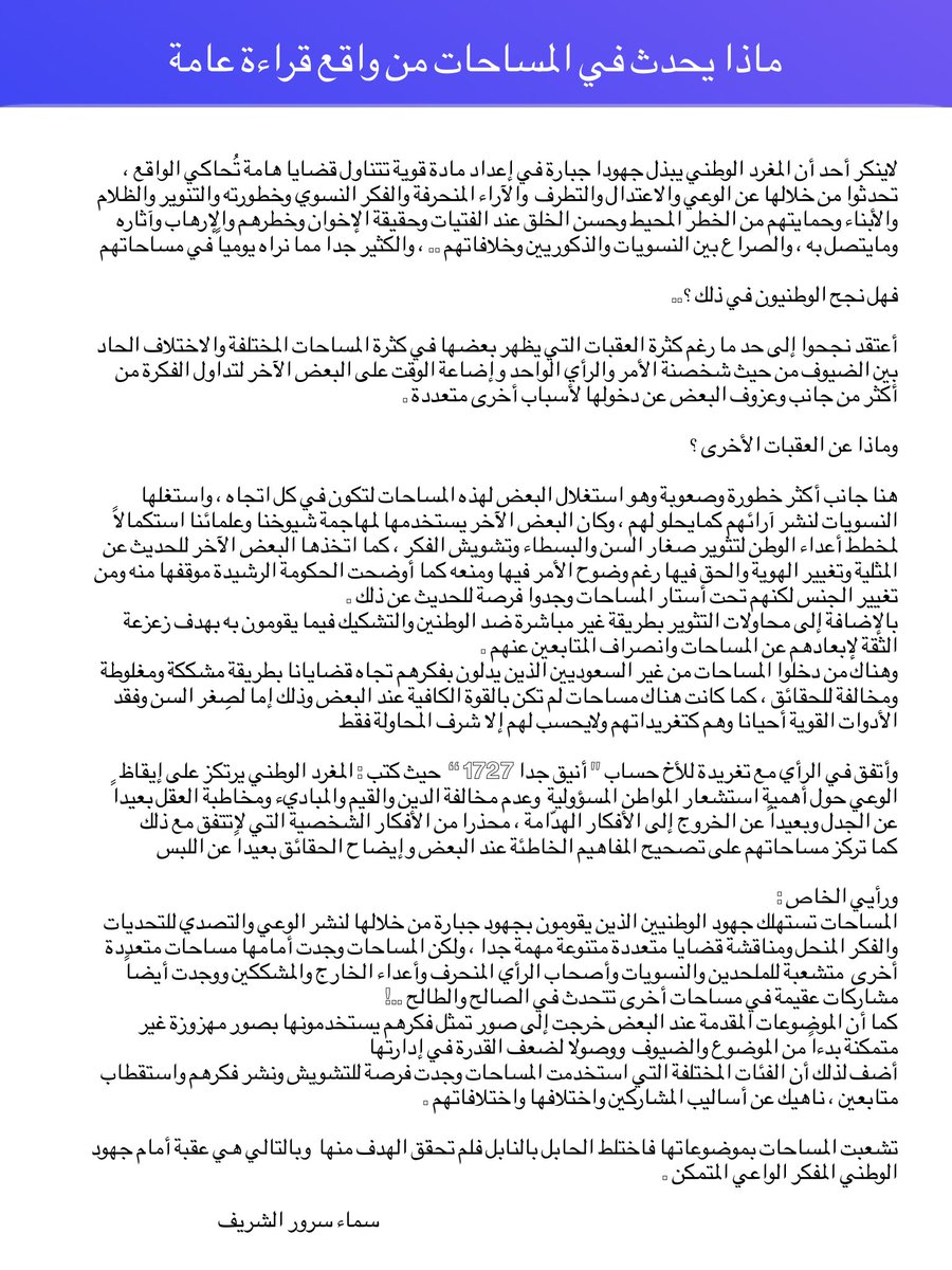 المساحات تستهلك جهود الوطنيين الذين يقومون بجهود جبارة من خلالها لنشر الوعي والتصدي للتحديات والفكر المنحل