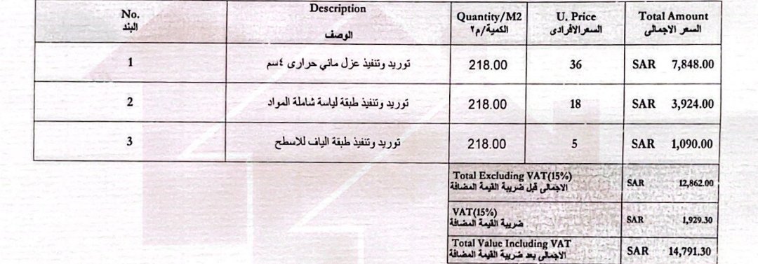بالنسبة للدهانات تم الاتفاق بمبلغ مقطوع ٥٠ الف ريال داخلي وخارجي +الالمنيوم ٧٠ ألف ريال لأن النوافذ عندي كبيرة تصل الأمتار إلى ٩٩م + المصعد ٧٢ الف ريال قيرلس بدون غرفة +الحجر للواجهات ٣٨ ألف ريال تطعيمات للواجهتين وليس الكل ..