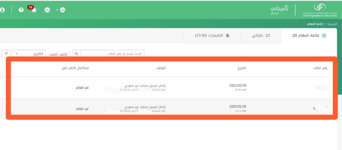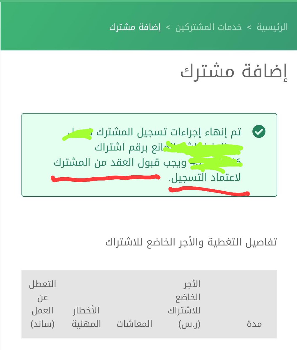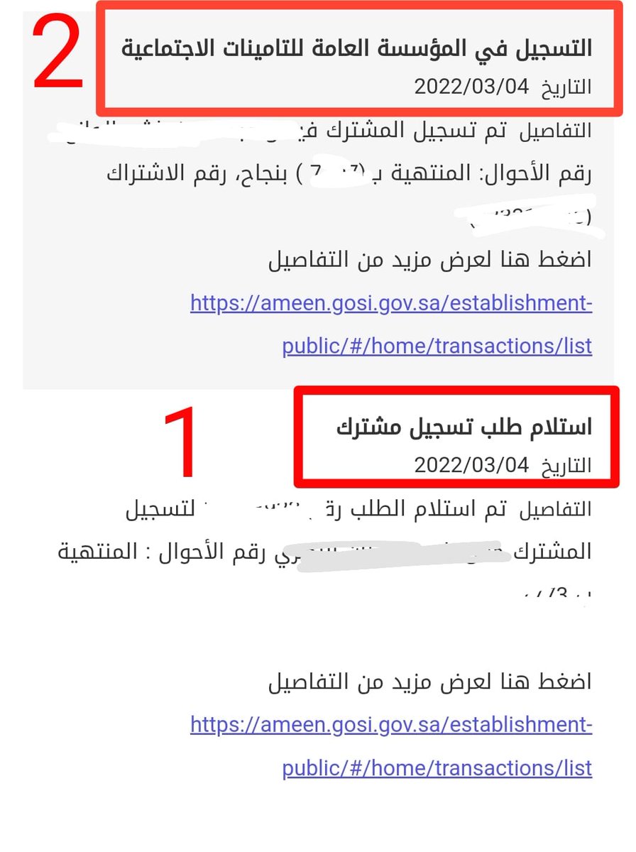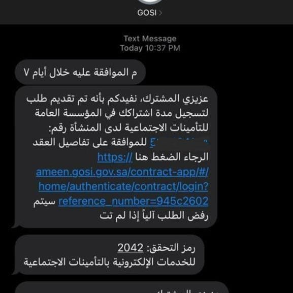 عزيزي المشترك، نفيدكم بأنه تم تقديم طلب لتسجيل مدة اشتراكك في المؤسسة العامة للتأمينات الاجتماعية لدى المنشأة رقم: للموافقة على تفاصيل العقد الرجاء الضغط هنا gosi.gov.sa