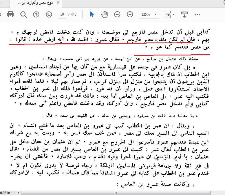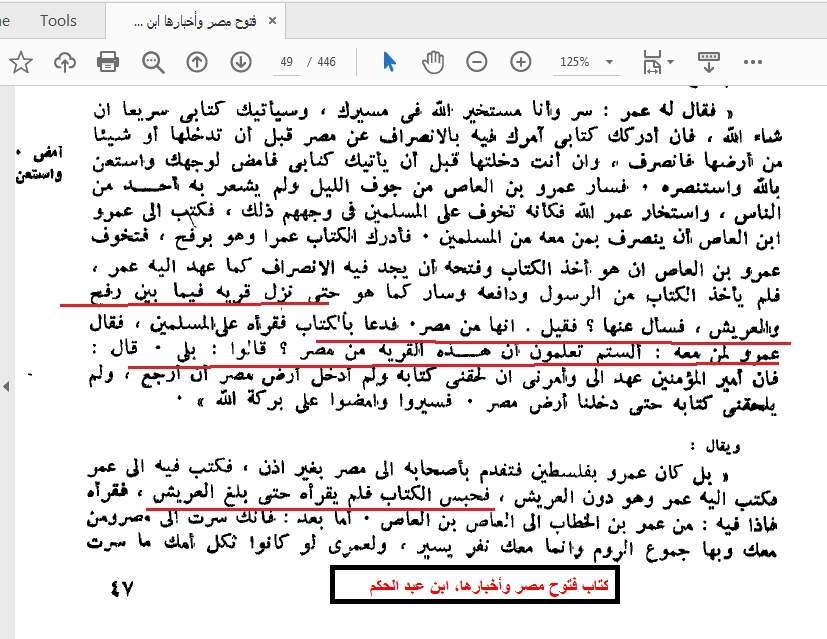 إنه لما عمرو بن العاص فتح رسالة ابن الخطاب سأل الناس (وكانو عرب) إحنا فين فقالوه في العريش (وفي كتابات تانية في رفح) من أرض مصر، فكمل طريقه
