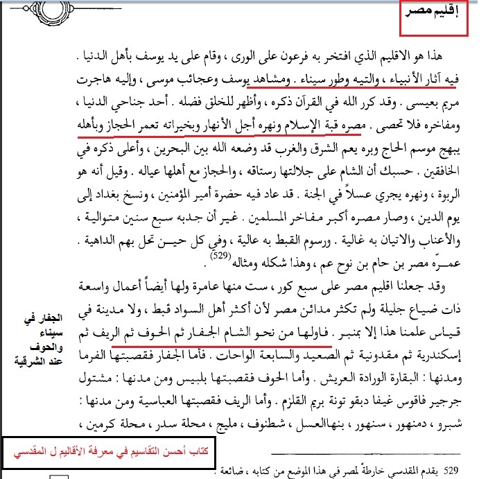 بعده بقرن كتب المقدسي ف كتاب "أحسن التقاسيم في معرفة الأقاليم"(القرن 4 هـ 10 م الاحتلال العبيدي/الفاطمي) عن حدود مصر: