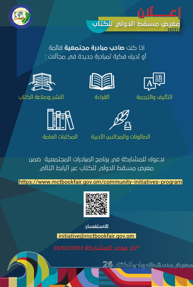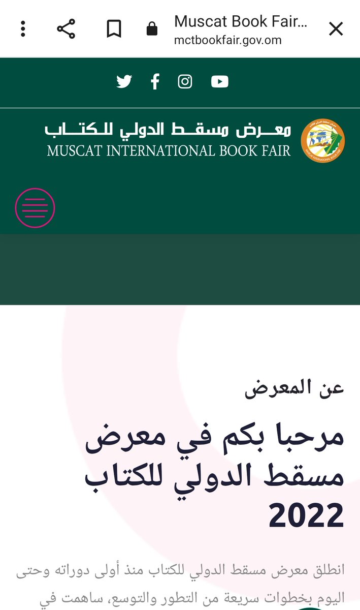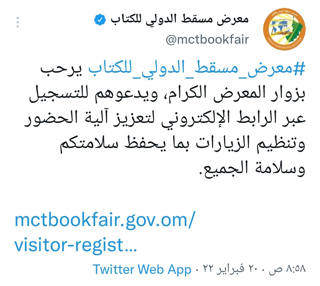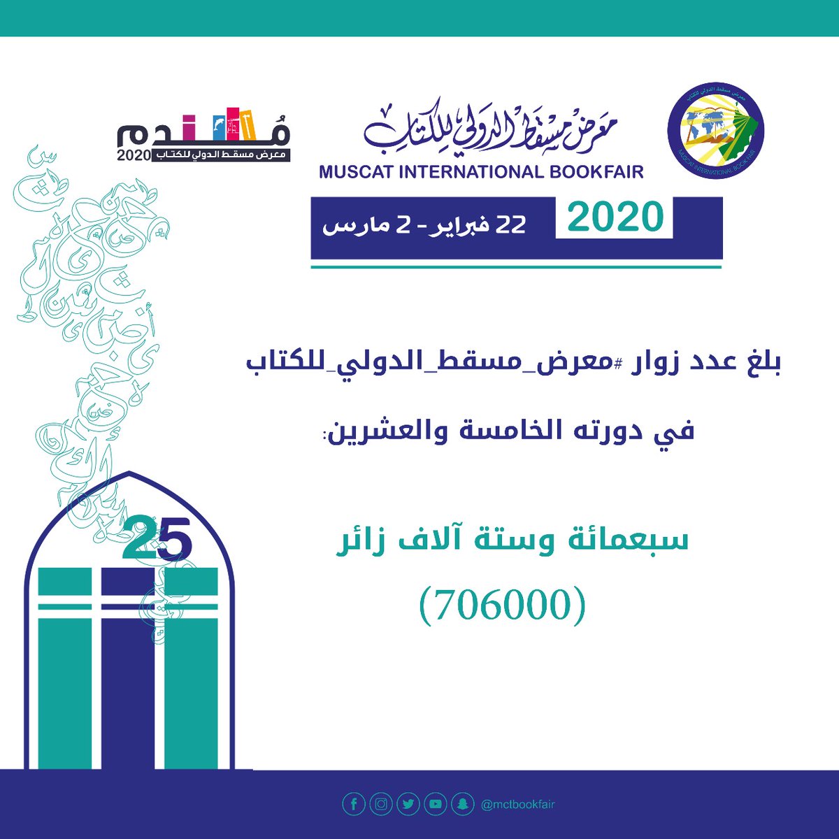🔹كان اختيار مركز ذاكرة عمان @tha_oman المؤسسة الثقافية للدورة السادسة والعشرين من معرض مسقط الدولي للكتاب تقديرا من اللجنة الرئيسية للمعرض وتحفيزا لبذل غاية الجهد في مستقبل الأيام، فلهم منا صادق العرفان، راجين أن تكون الدورات القادمة أكمل وأجمل وأكثر نجاحاً وإشراقاً.