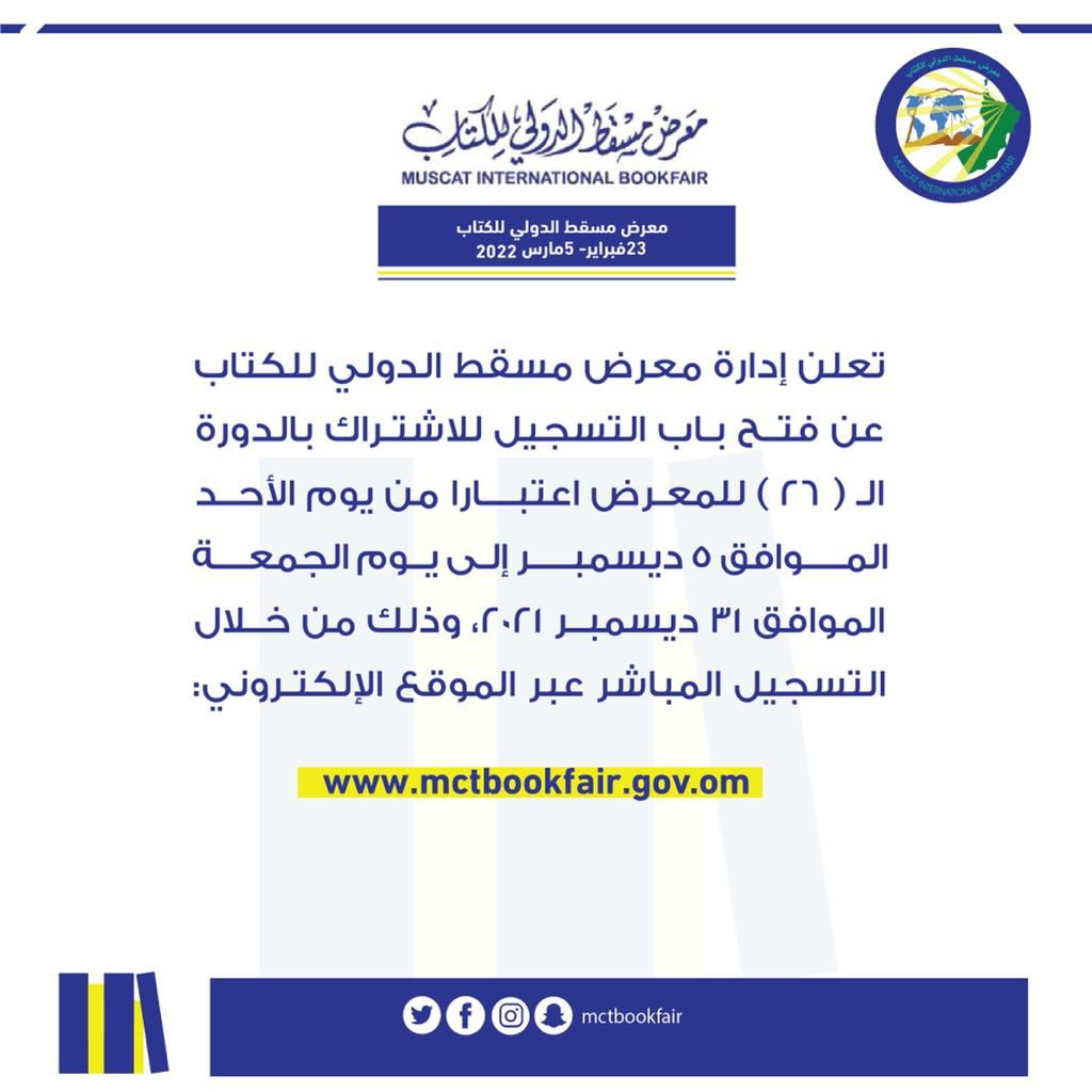 🔹في ٢٩ نوفمبر ٢٠٢١ صرح وزير الإعلام لوكالة الأنباء العمانية عن إقامة معرض مسقط الدولي للكتاب في دورته الـ(٢٦) من ٢٣ فبراير إلى ٥ مارس ٢٠٢٢، مع اتخاذ التدابير الاحترازية المقررة ضد انتشار فيروس كورونا، فكان تصريحه بشارة قابلها البعض بالتشكيك جراء متغيرات الجائحة المتقلبة حينها.