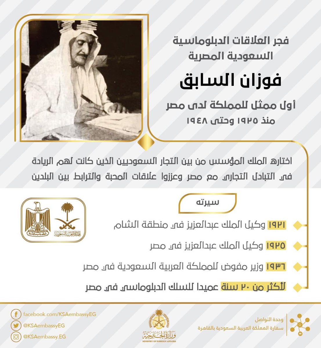كان عميداً للسلك الدبلوماسي بمصر مدة تزيد عن ثلاثين سنة، وله مكانة خاصة عند الملك عبد العزيز رحمه الله ، فهو لا يعامله كموظف، وإنما يعامله كشخصية لها مكانتها في المجتمع انه الشيخ فوزان بن سابق بن فوزان