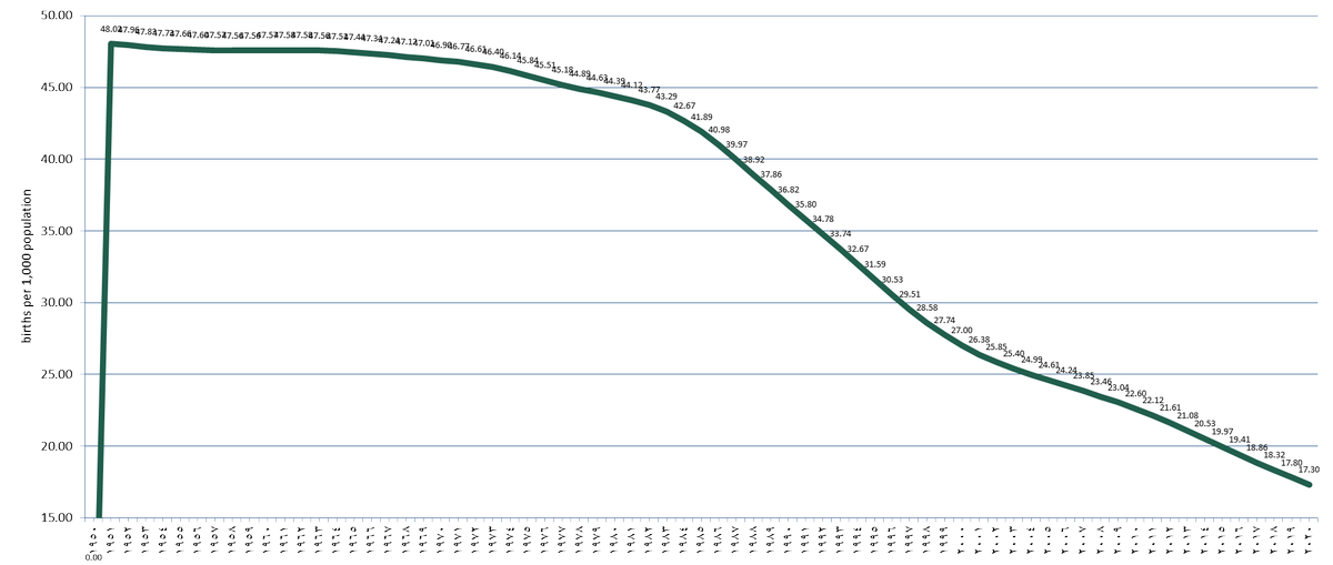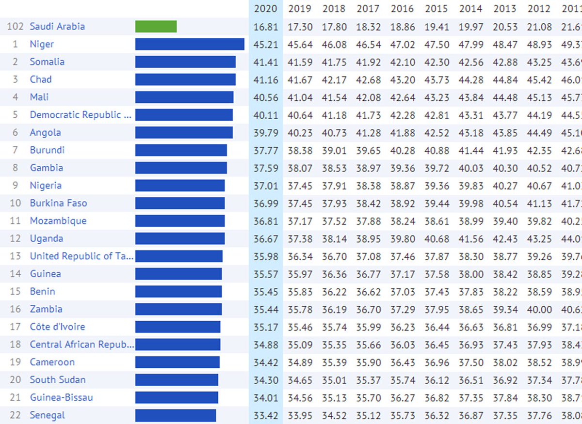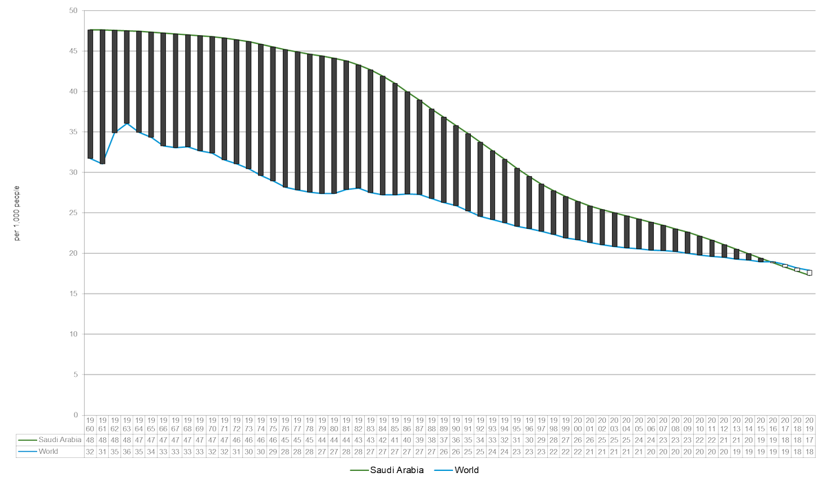 المؤشر الأخضر يخص معدل المواليد الجدد بالسعودية والأزرق معدل المواليد في العالم لاحظوا بعد أن كانت الفجوة كبيرة بينهما أصبح المعدل العالمي أعلى من المحلي في الأعوام الأخيرة بمعدلات طفيفة , لذا من المهم اطلاق حملة توعوية للصحة الانجابية وتنظيم الأسرة