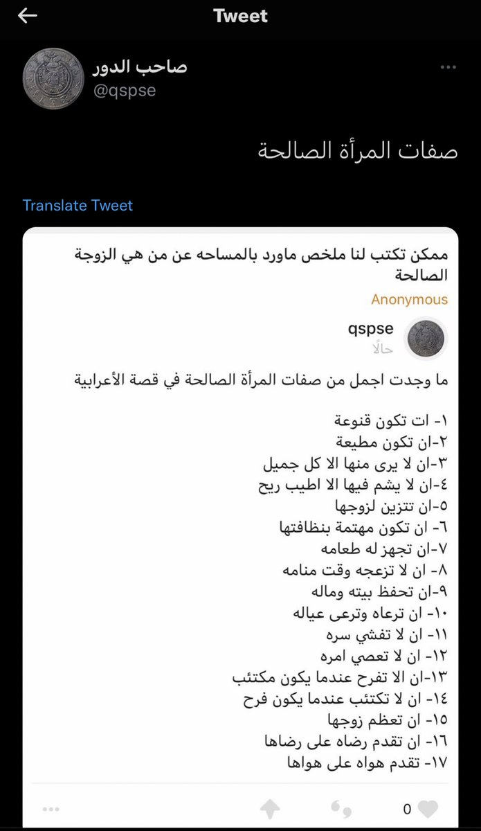 ١- ان تكون ربه منزل مطيعة وخادمة وحسنه التبعل لسيدها "زوجها" كما أمر به الشرع▪️
