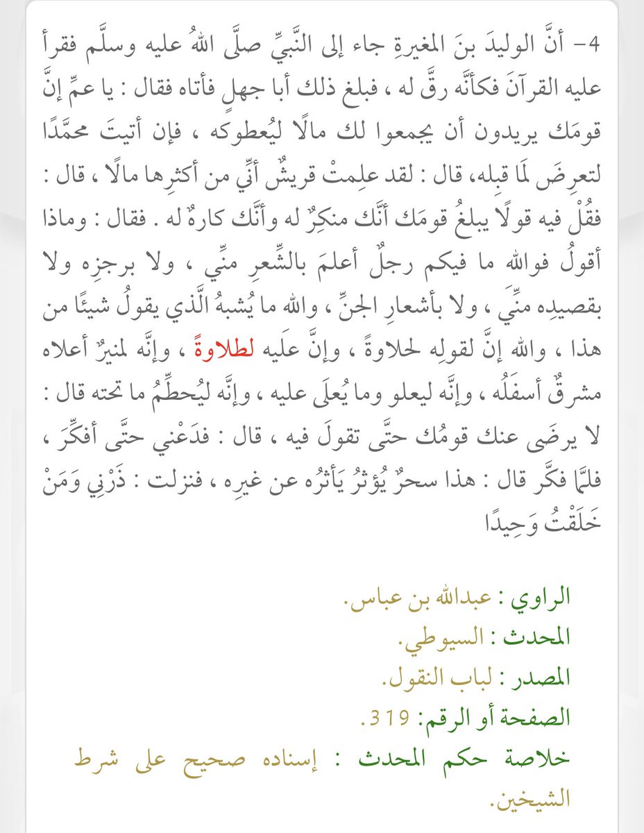 قد رأينا الكهنة وحالهم ، وسمعنا سجعهم :وقلتم شاعر ، لا والله ماهو بشاعر لقد رأينا الشعر ، وسمعنا أصنافه كلها ، هزجه، ورجزه وقريضة ، وقلتم مجنون، ولا والله ماهو بمجنون لقد رأينا الجنون فما هو بخنقه ولا وسوسته ولا تخليطه . المصدر [دلائل النبوة للبيهقي] (2/201)